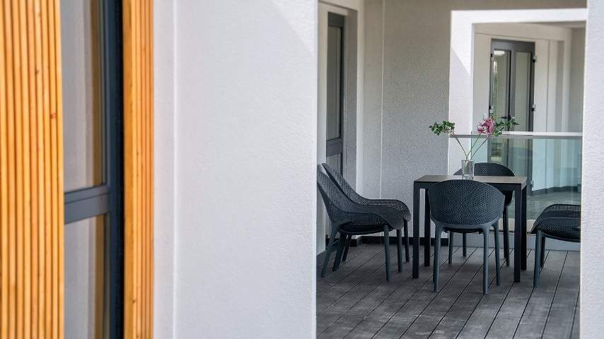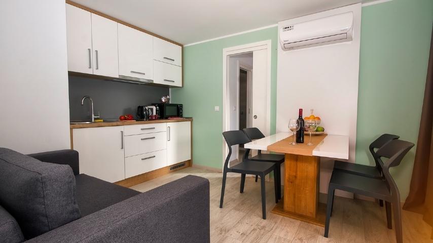 Kuhinja i dnevni boravak te velika terasa se dijele s drugom sobom.