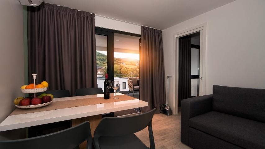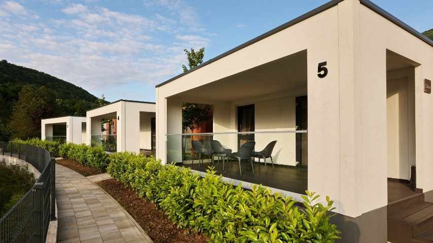 Za potpuni ugođaj i osjećaj komocije u našim kućicama modernog dizajna, nalaze se dvije spavaće sobe sa individualnim kupaonicama, zajednička kuhinja te vanjska terasa sa prekrasnim pogledom kojeg dočarava kamp te raskoš prirode koja ga okružuje.
